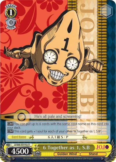 [CONT] You can put up to 6 cards with the same card name as this card into your deck. [CONT] This card gets +1 soul for each of your other "6 Together as 1, S.B".
